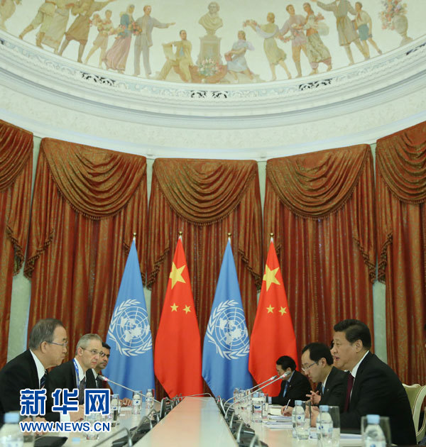 潘基文表示,聯合國高度贊賞中國在應對各種全球性挑戰方面發揮的領導作用。在安理會5個常任理事國中,中國是派出維和人員最多的國家。中方派軍艦參加敘利亞化學武器海運聯合護航行動,積極參與推動政治解決敘利亞、南蘇丹等地區熱點問題,充分證明中國在維護世界和平安全方面作出的重要貢獻。