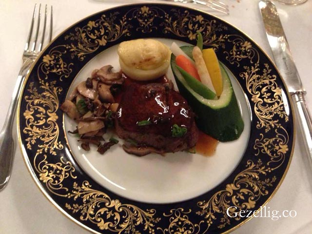 到主菜了,這是一道阿根廷名菜。Tournedos是位于里脊末端的那塊肉,通常都是厚且圓,根據個人口味可以三分至五分熟,鮮嫩至極。上桌時要搭配Madeira醬汁,是專門為肉類調配的。本次的菜還用了羊肚菌菇,因外形酷似羊肚而得名。蔬菜選了荷蘭人超喜歡的西葫蘆,挖空后,放上其他蔬果。另一個是酥皮焗土豆, Dauphinioise 這個詞來源于法語東南部的傳統地區Dauphine,這道菜是將土豆切片,然后和奶酪一起焗制,表皮是脆的。國宴上這道菜已經經過改良,做成了一小塊。