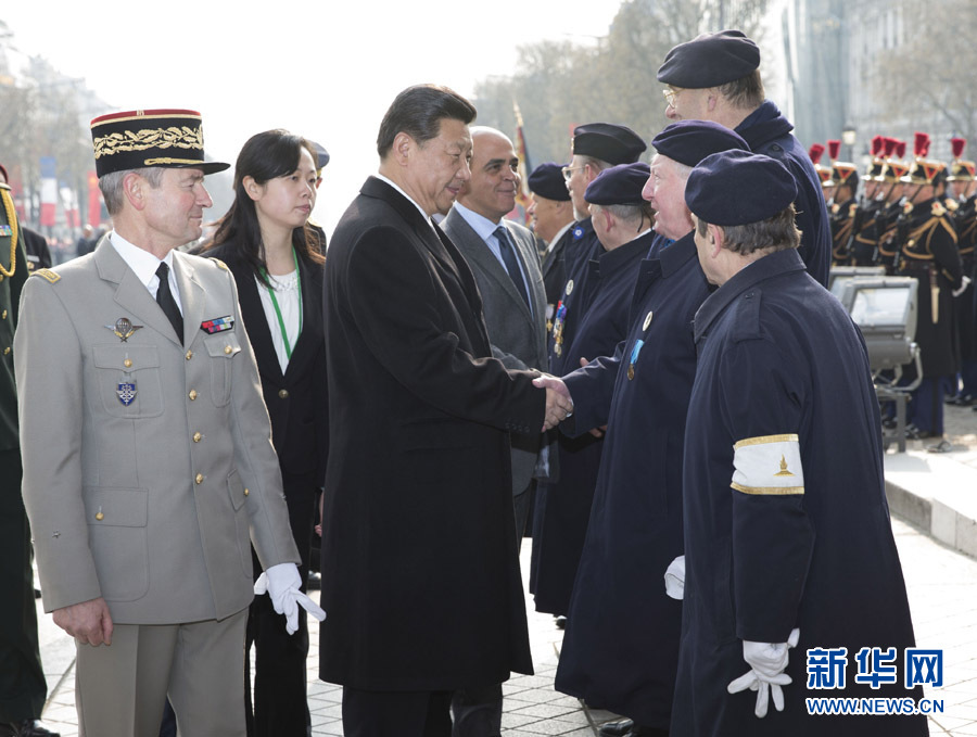 3月27日,國家主席習近平在巴黎向法國無名烈士墓獻花圈。這是習近平與老戰士交談。 新華社記者蘭紅光攝