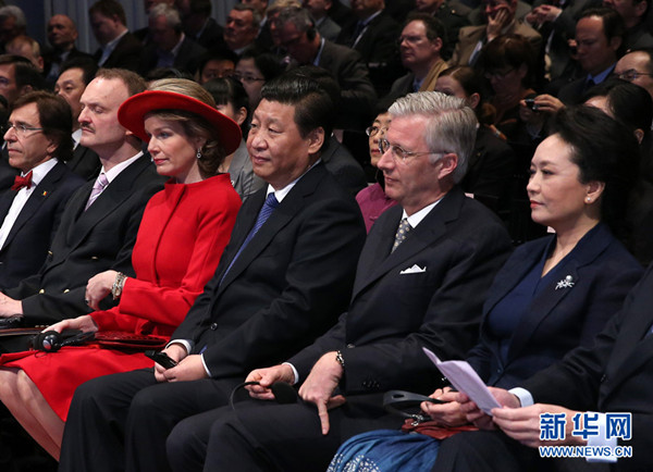 ????4月1日,國家主席習近平在比利時布魯日歐洲學院發表重要演講。這是在發表演講前,習近平和夫人彭麗媛在比利時國王菲利普和王后瑪蒂爾德的陪同下在會場就坐。新華社記者 龐興雷 攝