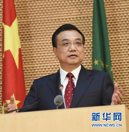 ??? 5月5日,國(guó)務(wù)院總理李克強(qiáng)在位于亞的斯亞貝巴的非洲聯(lián)盟總部發(fā)表題為《開(kāi)創(chuàng)中非合作更加美好的未來(lái)》的演講。 新華社記者 李學(xué)仁 攝