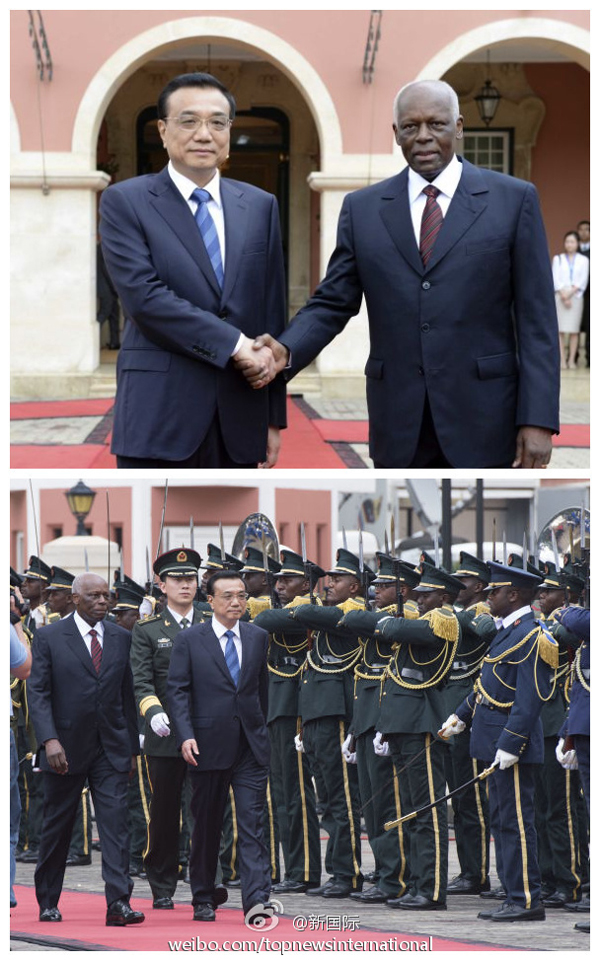 ????新華網北京5月9日電? 據新華社“新國際”微博報道,5月9日,國務院總理李克強在羅安達總統府出席安哥拉總統多斯桑托斯舉行的歡迎儀式。李克強總理在多斯桑托斯總統陪同下檢閱了儀仗隊。