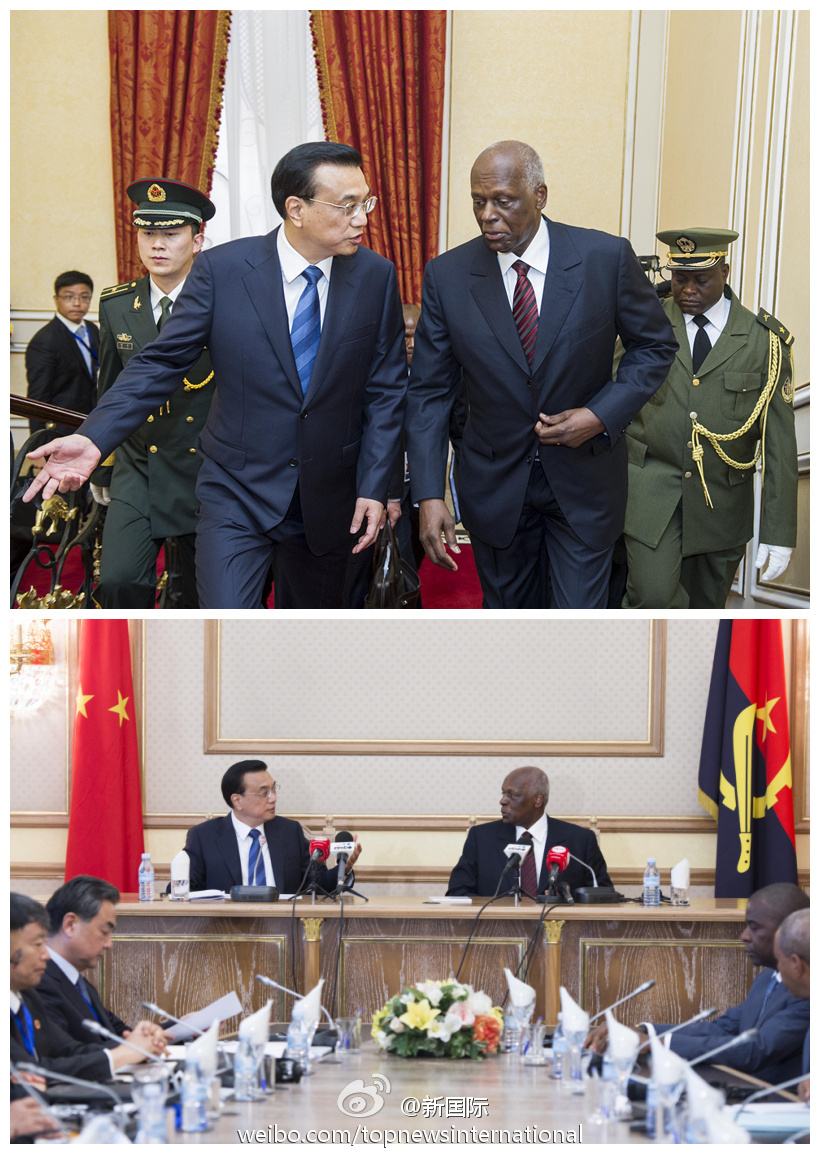 ????新華網北京5月10日電? 據新華社“新國際”微博報道,李克強總理9日與安哥拉總統多斯桑托斯舉行富有成果的會談,雙方同意成立工作組,全面規劃中安重點領域合作。中方將派出強力部門主要負責人牽頭,期待與安方進行友好合作。安總統表示,李克強的成功訪問,推動安中關系邁上新臺階。