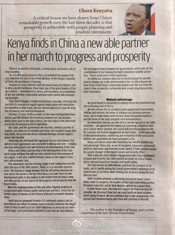????新華網北京5月11日電? 據新華社“新國際”微博報道,肯尼亞《旗幟報》11日發表肯雅塔總統署名文章《肯將中國視為發展繁榮進程中的強力伙伴》。文章稱,李克強此訪將進一步加深傳統友誼,推動雙方新時期合作。隨著多領域的良好合作,中國在肯經濟社會發展中重要性與日俱增。肯方對肯中關系未來充滿信心。