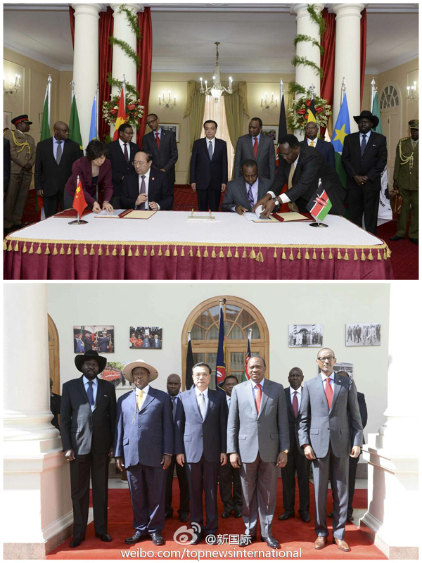 ??? 新華網北京5月11日電? 據新華社“新國際”微博報道,李克強總理、肯雅塔總統11日和東非其他五國總統或外長共同見證了中肯蒙巴薩-內羅畢鐵路相關合作協議的簽署。該鐵路是肯尼亞百年來建設的首條鐵路,將把中國的資金、技術、標準、裝備制造和管理經驗帶入非洲,為李克強此訪倡議的非洲“三大網絡”中的鐵路網建設再添動力。
