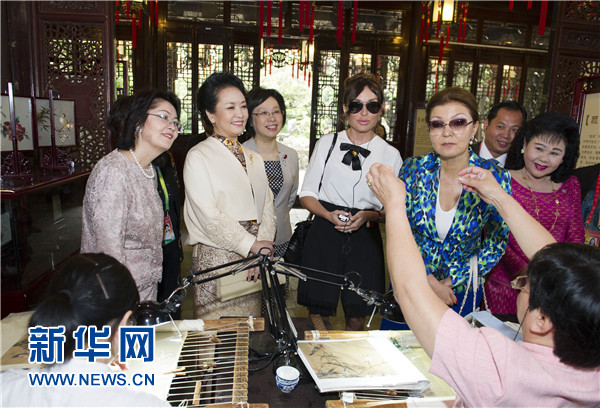 ????在還云樓,彭麗媛和來(lái)賓們欣賞少兒歌舞、京劇、昆曲、滬劇、太極拳、書(shū)法、剪紙藝術(shù)。濃濃的中國(guó)元素、精彩的文藝演出,贏得來(lái)賓們陣陣掌聲。