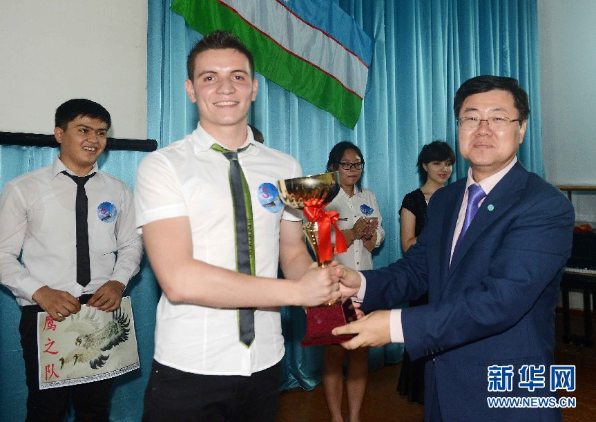??? 6月9日,烏茲別克斯坦首都塔什干的烏世界語言大學禮堂,中國駐烏茲別克斯坦使館孫立杰大使在向獲得冠軍的鷹之隊頒獎并合影留念。。