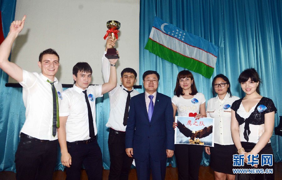 ??? 6月9日,烏茲別克斯坦首都塔什干的烏世界語言大學(xué)禮堂,中國駐烏茲別克斯坦使館孫立杰大使在向獲得冠軍的鷹之隊頒獎并合影留念。。