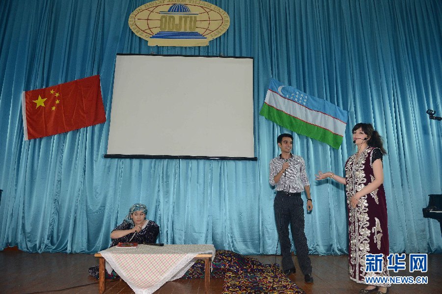 6月9日,學生代表在烏茲別克斯坦首都塔什干的烏世界語言大學禮堂表演節目。