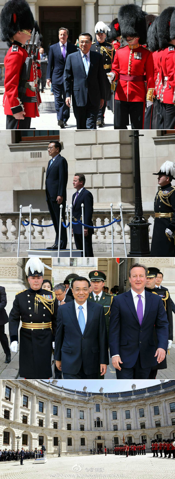 新華網北京6月17日電 據新華社“新國際”微博報道,當地時間17日中午,英國首相卡梅倫在英國財政部庭院內為李克強總理舉行隆重的歡迎儀式。軍樂隊奏中英兩國國歌。李克強在卡梅倫的陪同下檢閱了儀仗隊。