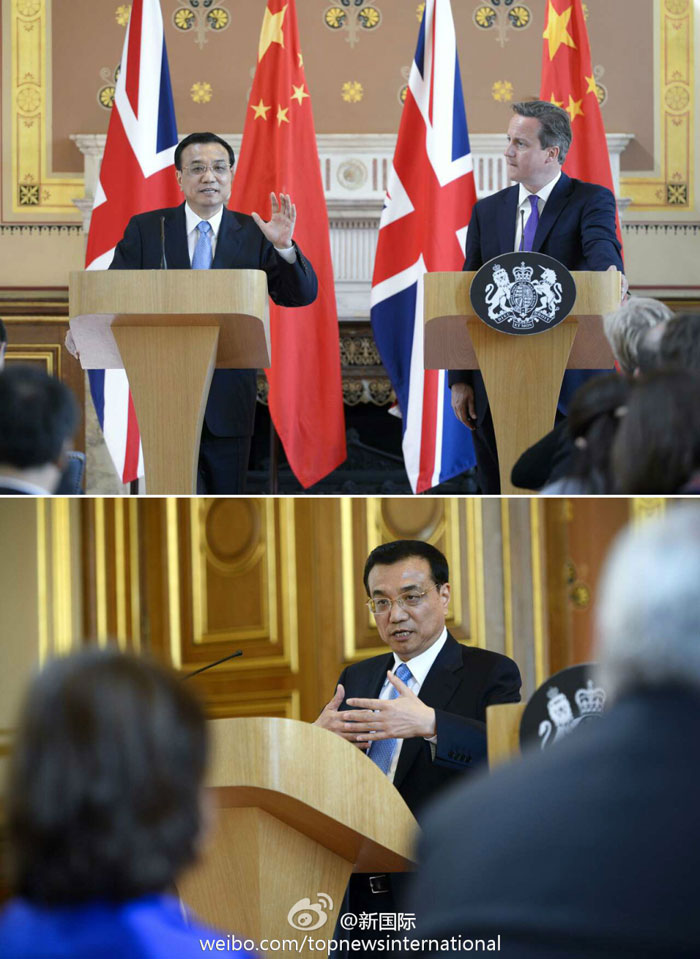 ??? 新華網北京6月18日電 據新華社“新國際”微博報道,17日,李克強與卡梅倫共見記者。李克強說,中英共同設立總額2億英鎊的科學基金,以加強聯合科學創新合作,第一個合作項目就是太空項目,這顯示了“我們合作的雄心”。未來5年中國將向英派遣1萬名公費留學生,也歡迎英國向中國派遣更多留學生。