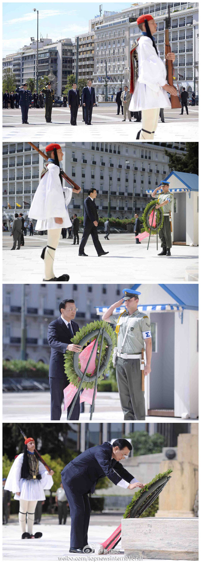 ??? 新華網(wǎng)北京6月20日電 據(jù)新華社“新國(guó)際”微博報(bào)道,正在希臘訪問(wèn)的李克強(qiáng)總理19日向希臘無(wú)名戰(zhàn)士紀(jì)念碑獻(xiàn)花圈。該紀(jì)念碑1932年建成,碑上鐫刻公元前5世紀(jì)希臘政治家伯里克利斯一篇悼詞中的兩句名言:“全世界杰出戰(zhàn)士之墓”、“安放無(wú)名氏的床第”,及希臘從上世紀(jì)初到五十年代與外國(guó)交戰(zhàn)的戰(zhàn)役名稱(chēng)和地名。
