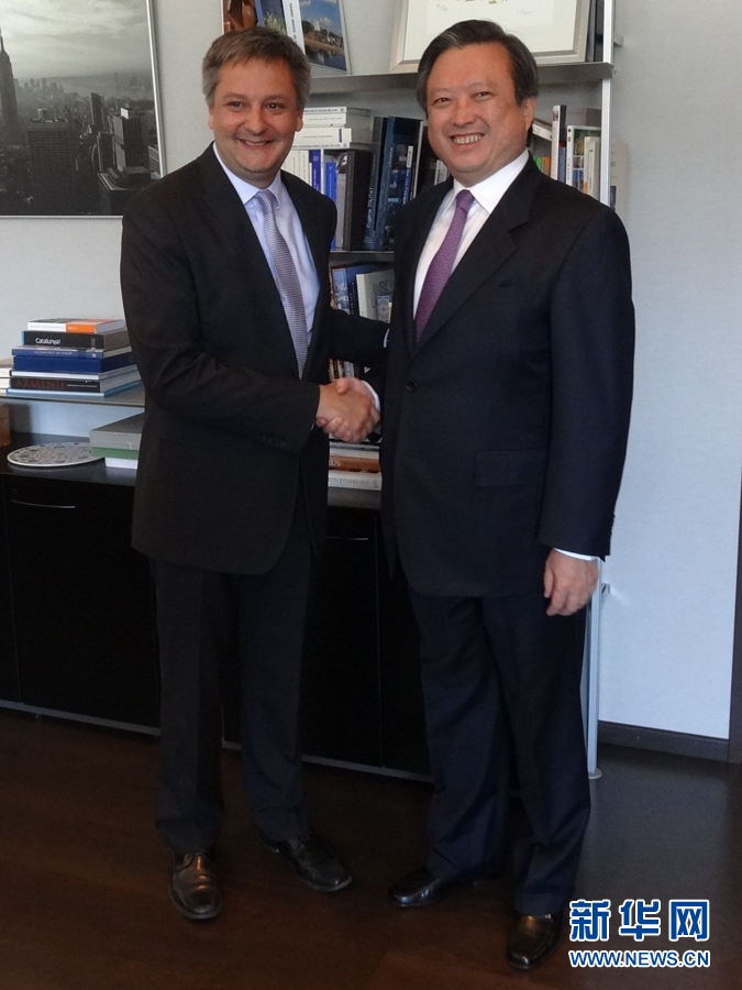 中國駐西班牙大使朱邦造與安道爾外交大臣薩沃亞會談前握手。新華網 周喆攝