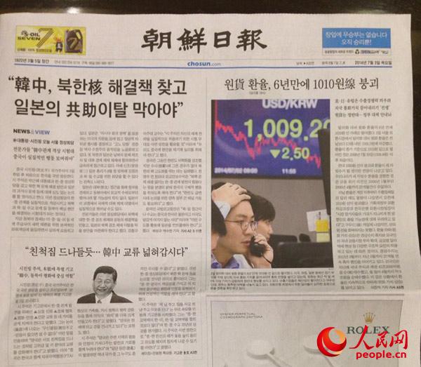 ??? 韓國(guó)《朝鮮日?qǐng)?bào)》在頭版顯著位置刊發(fā)習(xí)近平主席署名文章《中韓自古好鄰居 兩國(guó)友好風(fēng)好正揚(yáng)帆》 金慧廷 攝