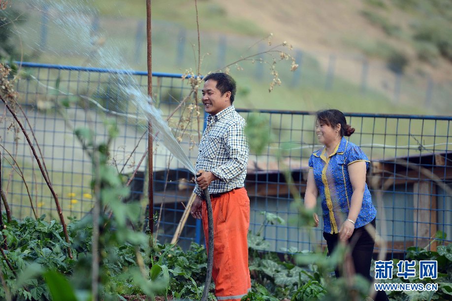 ????7月5日,烏茲別克斯坦安革連至琶布鐵路隧道項目安革連隧道進(jìn)口西口分部生活區(qū),楊清海在澆水。(沙達(dá)提 攝)