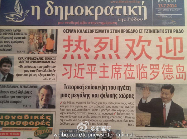 ????新華網(wǎng)北京7月14日電 據(jù)新華社“新國際”微博報道,希臘羅德島報紙《民主報》13日在頭版發(fā)表題為《一個偉大友好國家領(lǐng)導人的歷史性訪問》文章,并用中文紅色大字體寫著“熱烈歡迎習近平主席蒞臨羅德島”。文章說,熱情好客的羅德島人民祝愿習近平主席身體健康,祝愿中國在習主席領(lǐng)導下取得跨越式發(fā)展,祝愿中國繁榮昌盛。