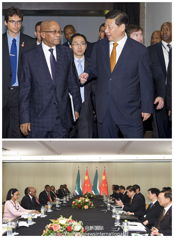 ???? 新華網北京7月15日電 據新華社“新國際”微博報道,習近平主席14日在巴西會見南非總統祖馬。習近平指出,和平與發展是非洲的主題。中非是命運共同體,我們愿意同非洲國家分享發展經驗,積極參與非洲和平安全事務,推進非洲跨國跨區域互聯互通項目,為促進非洲一體化作出更大貢獻。?