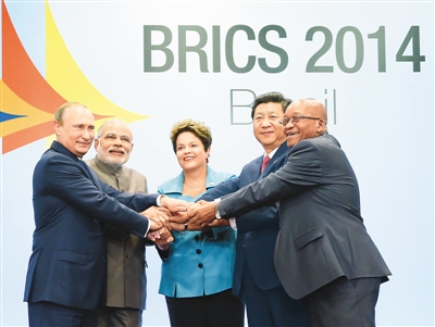 7月15日,習(xí)近平同出席會晤的巴西總統(tǒng)羅塞夫、俄羅斯總統(tǒng)普京、印度總理莫迪、南非總統(tǒng)祖馬合影。新華社記者 蘭紅光攝