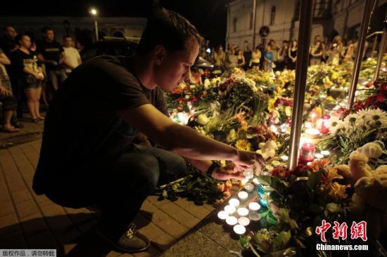 資料圖:7月17日,烏克蘭基輔,民眾們手持鮮花和蠟燭在荷蘭駐烏大使館前悼念馬航MH17事故遇難者。據稱,該架飛機上所載人數為298人,而此前報道稱飛機上共載295人。由于此次事件可能導致地面人員傷亡,總共的遇難人數將超過300人。