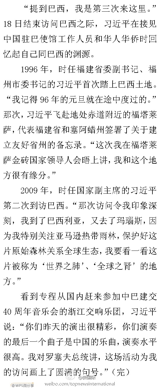 新華網北京7月19日電? 據新華社“新國際”微博報道,“提到巴西,我是第三次來這里。”18日結束訪問巴西之際,習近平在接見中國駐巴使館工作人員和華人華僑時回憶起自己同巴西的淵源。