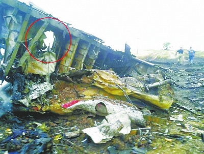 從這張殘骸照片來看,機身上有比臉盆略大的孔洞,破壞方向從機體外部沖向內部,懷疑是導彈的戰(zhàn)斗部碎片擊中的一塊區(qū)域。