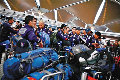 當(dāng)?shù)貢r間7月18日,馬來西亞國際機場,馬來西亞派特殊救災(zāi)和救援小組成員前往MH17墜機事故現(xiàn)場。圖/CFP