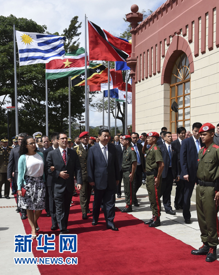 ????習(xí)近平抵達(dá)時(shí),委內(nèi)瑞拉副總統(tǒng)阿雷亞薩和夫人、查韋斯女兒羅莎率政府部長(zhǎng)和三軍高級(jí)將領(lǐng)迎接。