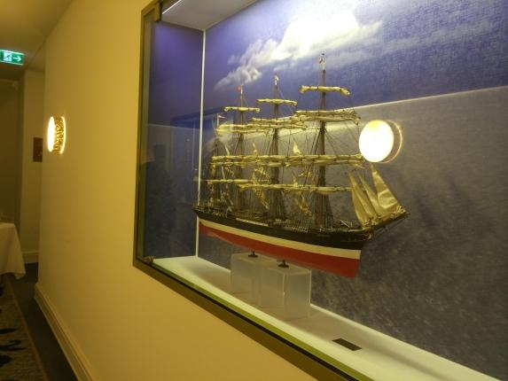 酒店布置得古香古色,每一層走廊兩側(cè)都裝飾有各種各樣與航海有關(guān)的物件——1900年的船長塑像、1903年的古老帆船、1930年的船舵……