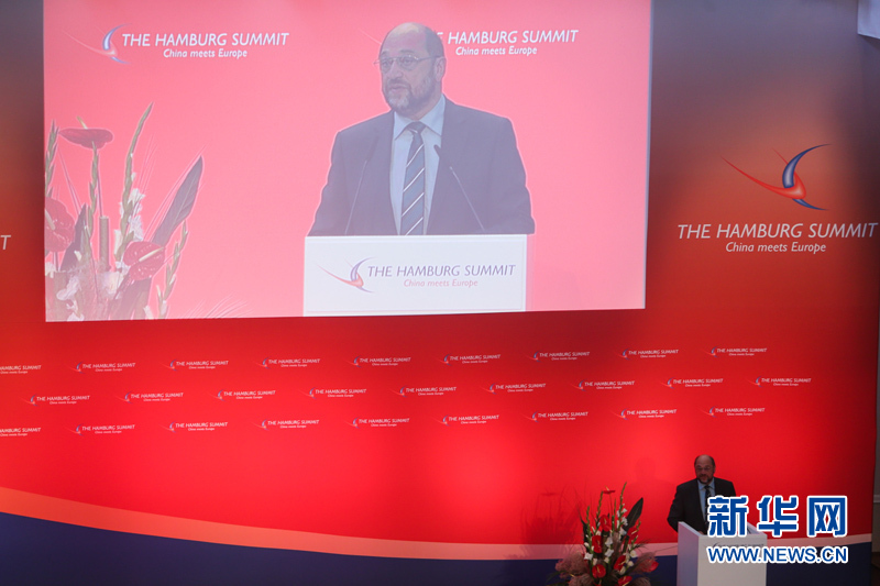 ??? 10月11日,在德國漢堡舉行的中歐論壇漢堡峰會上,歐洲議會主席馬丁?舒爾茨發(fā)言。中歐論壇漢堡峰會第六屆會議11日在德國漢堡閉幕。本屆峰會以“中國與歐洲相遇”為主題。來自中歐政治、經(jīng)濟和學術界的500多位代表聚集在一起,探討中歐經(jīng)貿(mào)合作未來趨勢、中國經(jīng)濟的綠色發(fā)展等重要議題。新華社記者張帆攝