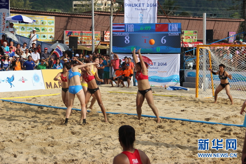 ??? 11月16日,中國沙灘手球運動員宮艷(左二)在比賽中擲球瞬間。中國體育代表團16日在泰國普吉舉行的第四屆亞洲沙灘運動會上勇奪2枚金牌和2枚銅牌。當天比賽全部結束時,中國隊以3金2銀5銅的成績暫列獎牌榜第五。新華社發(塔納攝)