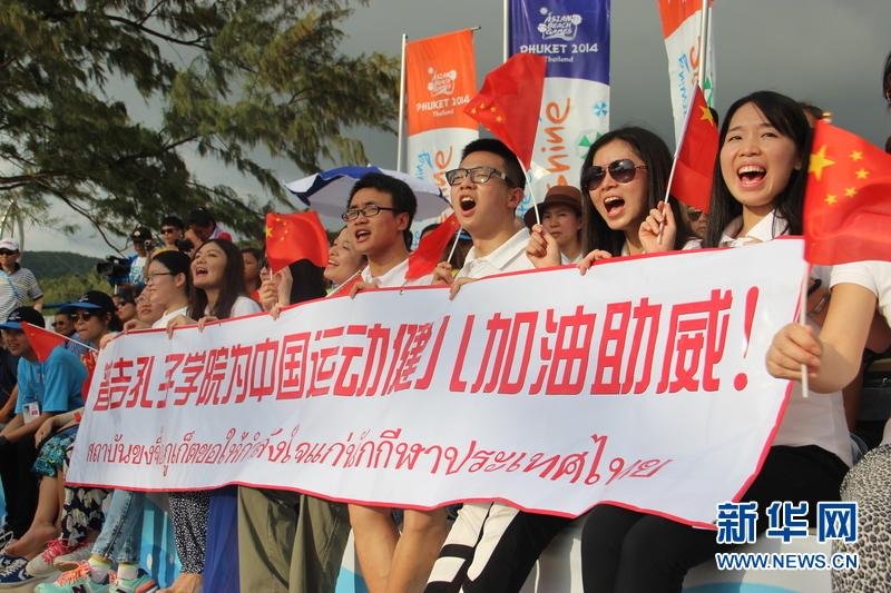 ??? 11月16日,普吉孔子學(xué)院的中國(guó)志愿者老師們?yōu)橹袊?guó)運(yùn)動(dòng)健兒加油。中國(guó)體育代表團(tuán)16日在泰國(guó)普吉舉行的第四屆亞洲沙灘運(yùn)動(dòng)會(huì)上勇奪2枚金牌和2枚銅牌。當(dāng)天比賽全部結(jié)束時(shí),中國(guó)隊(duì)以3金2銀5銅的成績(jī)暫列獎(jiǎng)牌榜第五,東道主泰國(guó)隊(duì)以9金11銀12銅的成績(jī)暫列金牌榜和獎(jiǎng)牌榜第一。新華社記者楊云燕攝
