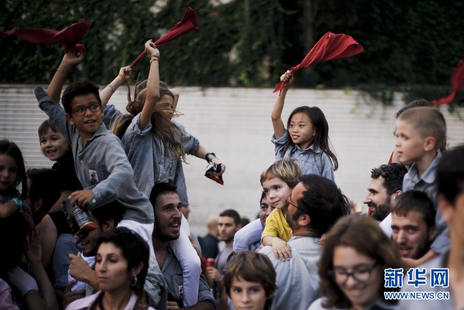 表演結束后,Jana和同伴們一起慶祝“疊人塔”成功。新華社巴塞羅那分社攝影師Pau Barrena 攝