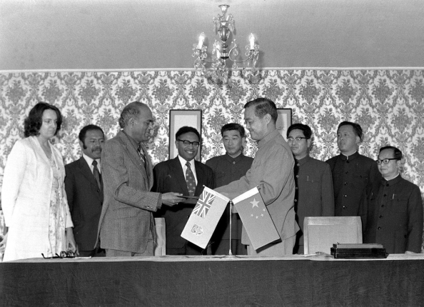????(1975年11月5日,中國與斐濟建交。圖為中國和斐濟在澳大利亞首都堪培拉簽署建交公報后,雙方代表交換文件。新華社發)