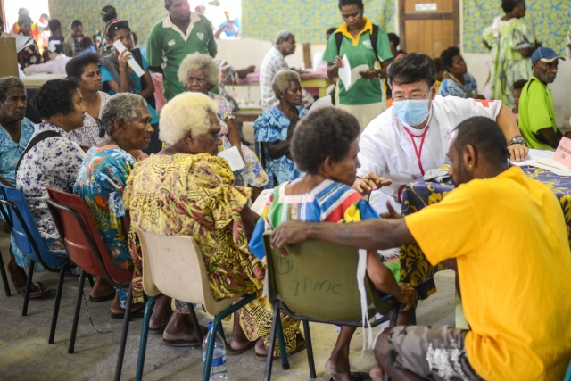 ????(圖為2014年9月5日,中國海軍和平方舟醫院船的前出醫療分隊前往位于瓦努阿圖首都維拉港郊區的美麗村,為因路途較遠而不方便前往和平方舟醫院船就診的當地居民進行醫療服務。新華社記者覃海石攝)