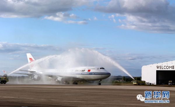 ???? ?11月21日,國(guó)家主席習(xí)近平抵達(dá)楠迪,開(kāi)始對(duì)斐濟(jì)進(jìn)行國(guó)事訪(fǎng)問(wèn)并將同太平洋建交島國(guó)領(lǐng)導(dǎo)人舉行會(huì)晤。圖為習(xí)近平乘坐的專(zhuān)機(jī)在楠迪國(guó)際機(jī)場(chǎng)跑道上滑行穿過(guò)“水門(mén)”,這是當(dāng)?shù)亟o予最尊貴客人的禮遇,表達(dá)為客人“洗塵”。 新華社記者 丁林 攝