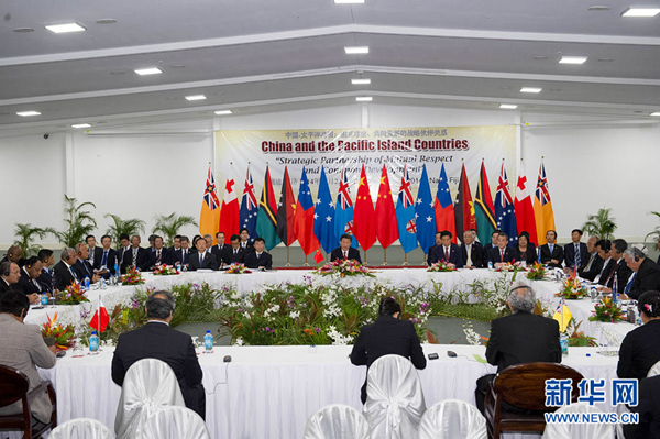 ???? 11月22日,國家主席習近平在楠迪同斐濟總理姆拜尼馬拉馬、密克羅尼西亞聯邦總統莫里、薩摩亞總理圖伊拉埃帕、巴布亞新幾內亞總理奧尼爾、瓦努阿圖總理納圖曼、庫克群島總理普納、湯加首相圖伊瓦卡諾、紐??偫硭忍窖髰u國領導人舉行集體會晤。習近平主持會議并發表主旨講話。新華社記者 饒愛民攝