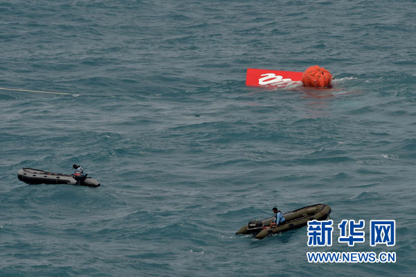 ??? 1月10日,工作人員駕駛橡皮艇協助打撈亞航失事客機的機尾殘骸。 據報道,搜救人員當日已將亞航失事客機的機尾殘骸撈出海面。 新華社發