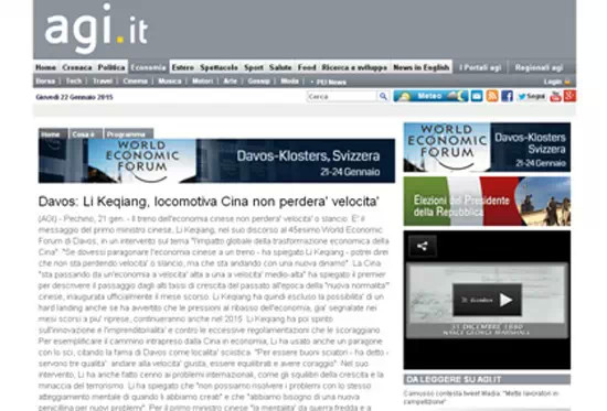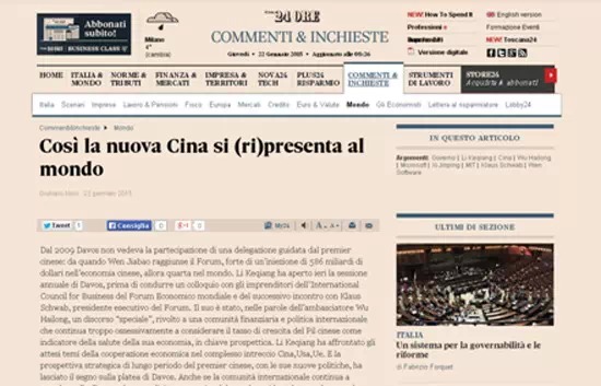 意大利24小時(shí)太陽報(bào)1月22日發(fā)表題為《中國重新向世界自我介紹》的評論性文章,介紹了李克強(qiáng)在世界經(jīng)濟(jì)論壇上的講話。文章稱,雖然國際社會(huì)一直在用西方國家的種族主義中心心態(tài)以及舊的眼光看待中國,中國國務(wù)院總理李克強(qiáng)的長期戰(zhàn)略眼光和他的新政策還是給達(dá)沃斯的聽眾們留下深刻印象。