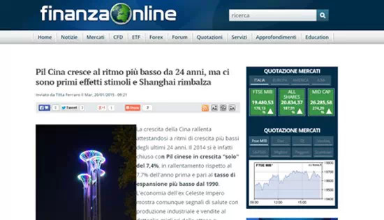 意大利財(cái)經(jīng)在線網(wǎng)站1月20日發(fā)表文章稱雖然2014年中國的國內(nèi)生產(chǎn)總值是24年來最低,但工業(yè)生產(chǎn)、零售業(yè)和股市都釋放出健康和積極的信號。