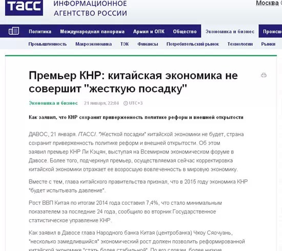 塔斯社發(fā)表了一篇名為《中國總理:中國經(jīng)濟(jì)不會(huì)硬著陸》的文章。文中指出,李克強(qiáng)和中國央行行長周小川在達(dá)沃斯論壇期間均表示,中國將深化改革開放,漸緩的增長速度有利于中國經(jīng)濟(jì)的轉(zhuǎn)型。在3月份舉行的中國兩會(huì)上,中國政府將提出新的經(jīng)濟(jì)發(fā)展規(guī)劃,速度肯定不會(huì)是北京追求的首要目標(biāo)。
