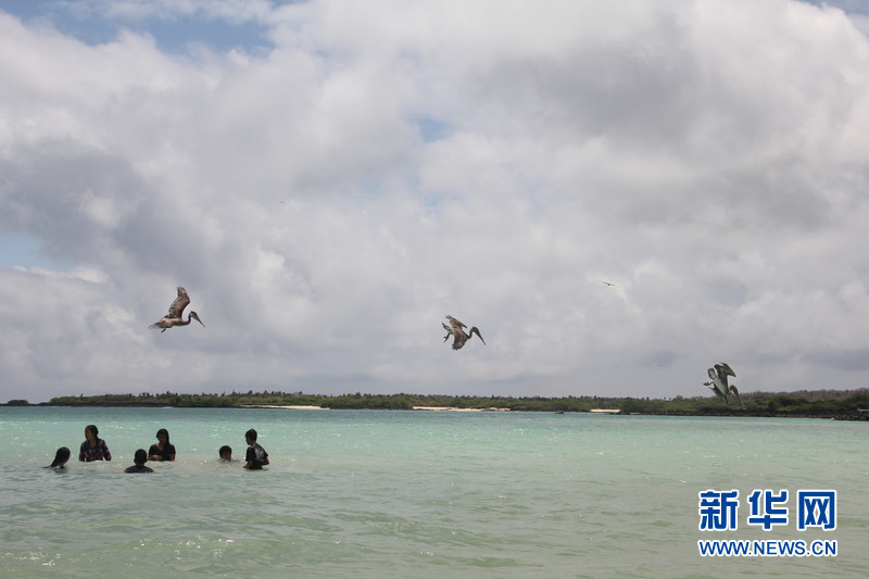 加拉帕戈斯群島中部的圣克魯斯(Santa Cruz)島上,數只鵜鶘在捕食,人們在水中嬉戲,相處和諧。