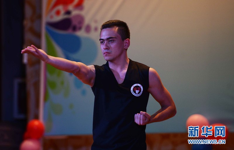 4月28日,在烏內(nèi)務(wù)部文化宮禮堂,來自烏茲別克斯坦世界語(yǔ)言大學(xué)的DJAVDAT(中文名:張睿)在參加比賽。新華網(wǎng)記者 沙達(dá)提攝