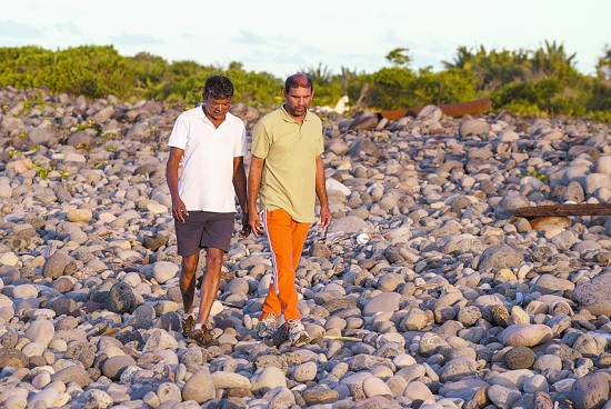 當地時間7月30日,約翰尼·貝格(右)和朋友一起在海灘上行走,他正是在法屬留尼旺島上發現疑似MH370殘骸的人。CFP供圖