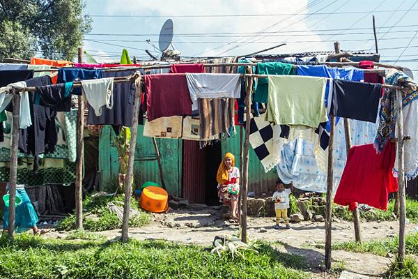 ↑2013年10月13日,在埃塞俄比亞首都亞的斯亞貝巴一處貧民窟內(nèi),一名婦女坐在自家門口的晾衣桿前。(新華社記者李京攝)