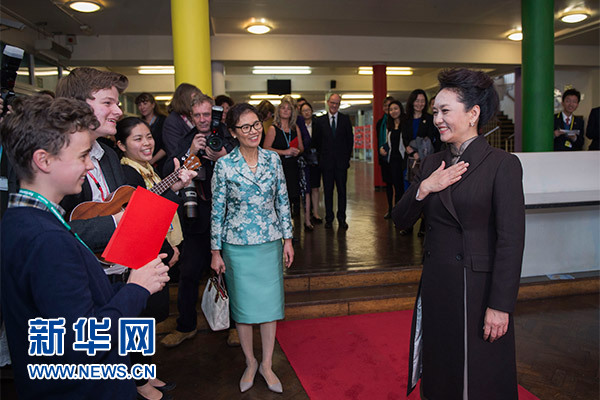在英國教育部國務大臣吉布、學校校長等陪同下,彭麗媛觀看學生們用中文進行的才藝表演,參觀學校成果展,觀摩中文課,與女學生們互動交流,并向學校贈送中國文化及漢語學習類圖書及音像制品。