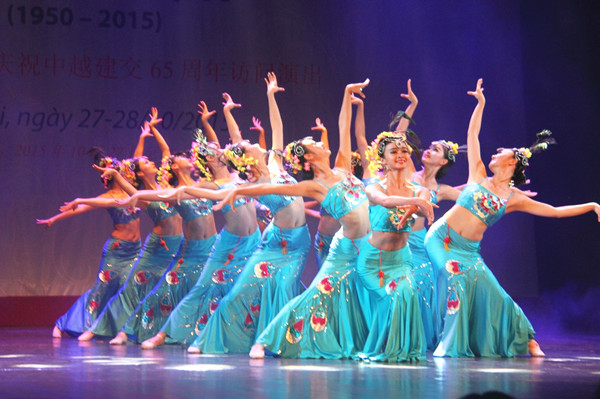 2015年10月27日,中國云南省藝術(shù)團(tuán)在越南首都河內(nèi)表演傣族舞蹈《美的祝福》,慶祝中越建交65周年。
