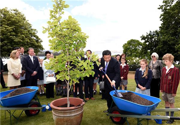圖為2014年11月18日,習(xí)近平在澳大利亞塔斯馬尼亞州與小學(xué)生共同植樹。(饒愛民攝)