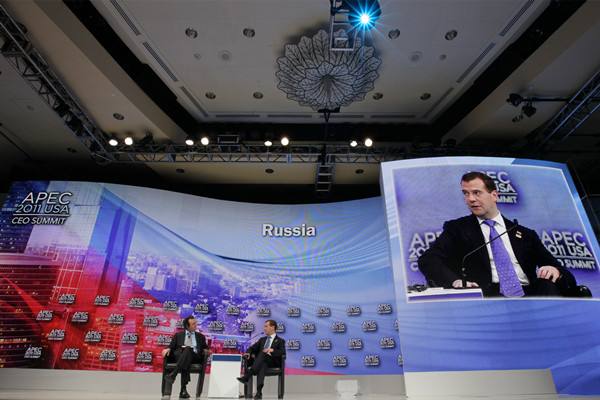 2011年11月13日,俄羅斯總統梅德韋杰夫出席在美國夏威夷州首府檀香山舉行的APEC工商領導人峰會。