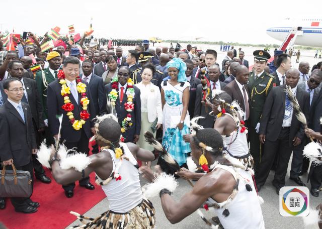 上午10時15分左右,專機降落,習主席和夫人彭麗媛走下旋梯。奏中津兩國國歌,鳴21響禮炮,檢閱儀仗隊,當?shù)貎和I花環(huán)和鮮花……前來迎接的津巴布韋總統(tǒng)穆加貝,為習主席舉行了隆重的歡迎儀式。