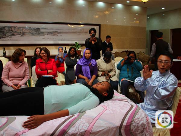 圖為中國援納米比亞醫療隊成員王鵬(前右)演示按摩手法。(新華社記者吳長偉攝)